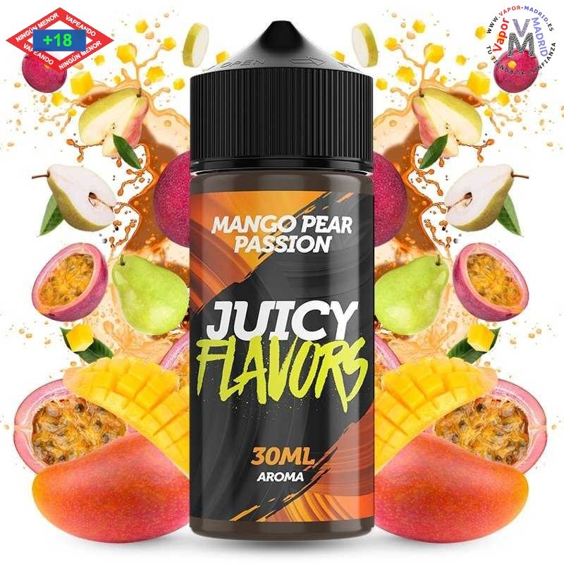 El aroma Mango Pear Passion en formato Longfill de Juicy Flavors ofrece una explosión de sabores tropicales, donde el mango se une con el sabor de la pera y la fruta de la pasión.