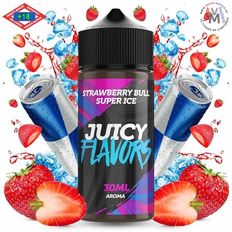 El aroma Strawberry Bull Super Ice en formato Longfill de Juicy Flavors captura la esencia de una burbujeante y deliciosa bebida energética con los matices de la dulce y jugosa fresa, todo ello coronado con un toque de frescor intenso.
