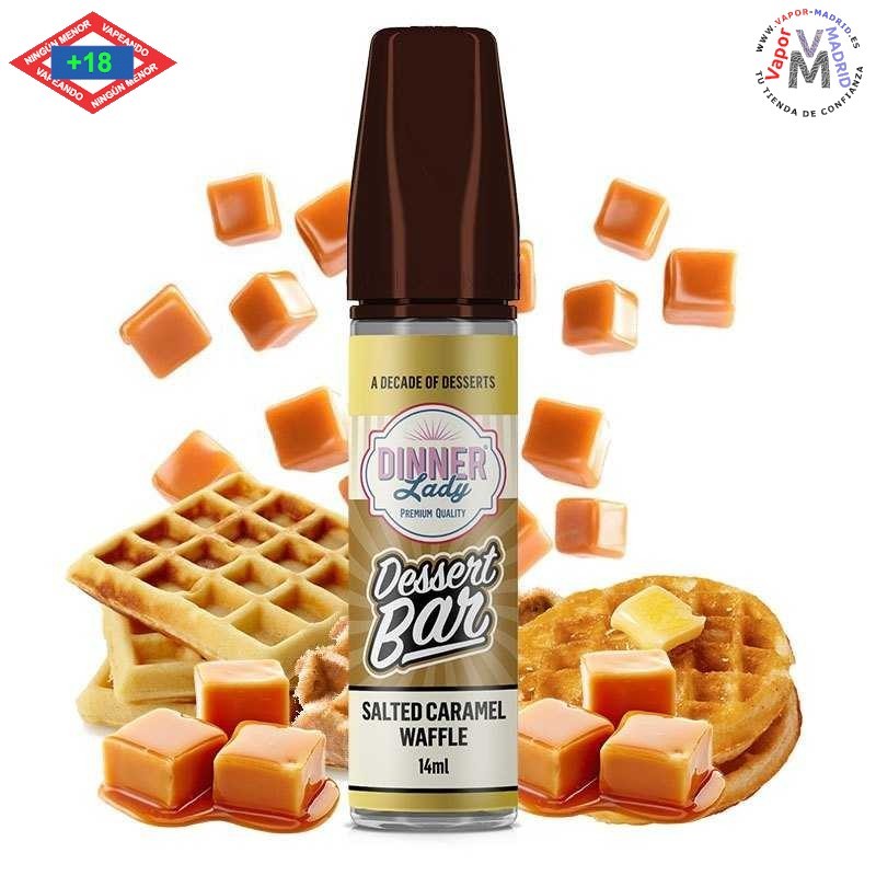 El aroma Salted Caramel Waffle de Dinner Lady en formato Longfill de la gama Dessert Bar, sabe a un crujiente gofre con caramelo salado y un toque de nata como topping. Un equilibrio perfecto entre lo salado y lo dulce.