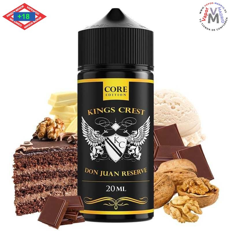 El aroma Don Juan Reserve en formato Longfill de Kings Crest nos sorprende con esta tarta de chocolate recubierta con mantequilla de nueces pecán y crema batida.