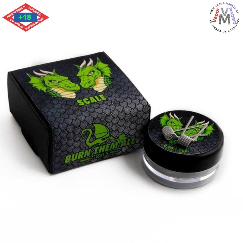 Las Resistencias Burn Them All Coils Scale 0.20ohm Dual Full N80 son de masa ultra reducida ideal para atomizadores de 22/24 mm dual.Ideal para atomizadores pequeños single o dual. Están diseñadas para ofrecer un vapeo suave, sabores intensos y grandes nubes de vapor.